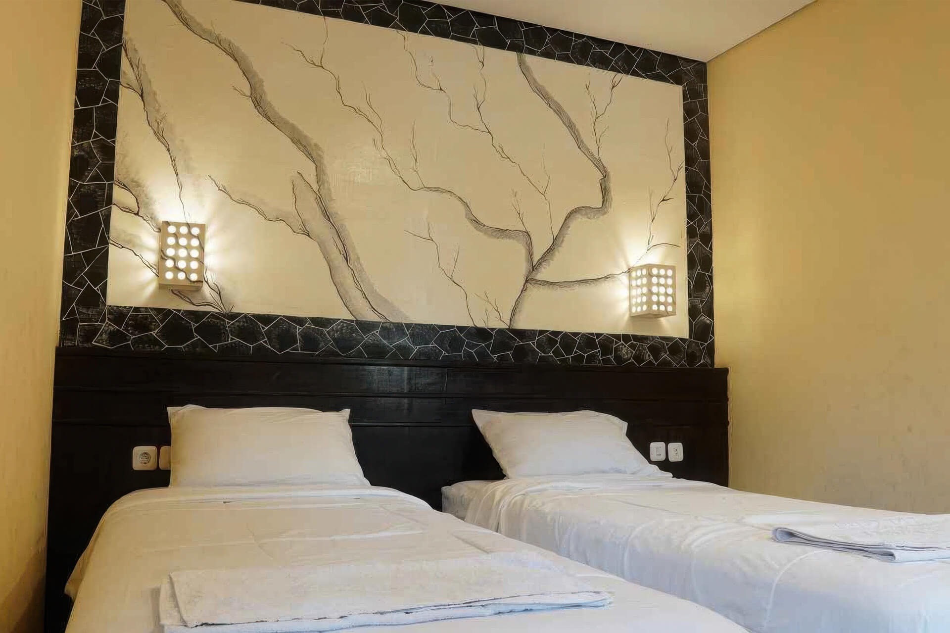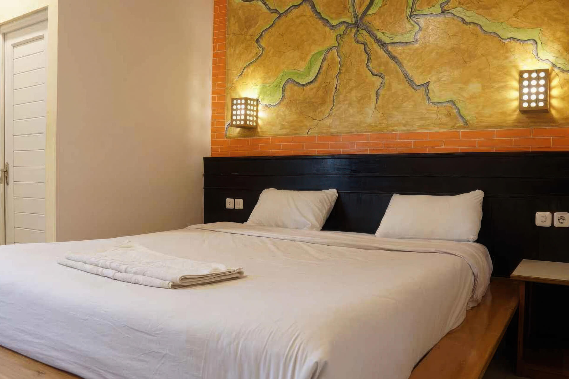 Interior kamar didominasi warna-warna alam dengan sentuhan kayu dan ornamen lokal, menciptakan nuansa hangat yang menyatu dengan lingkungan sekitar. Cahaya alami yang masuk dari jendela besar akan membuat Anda betah berlama-lama.