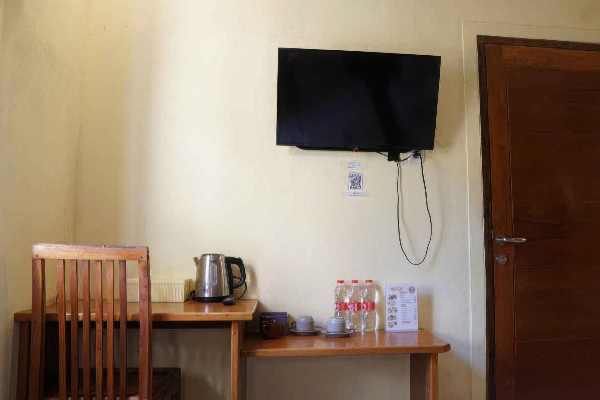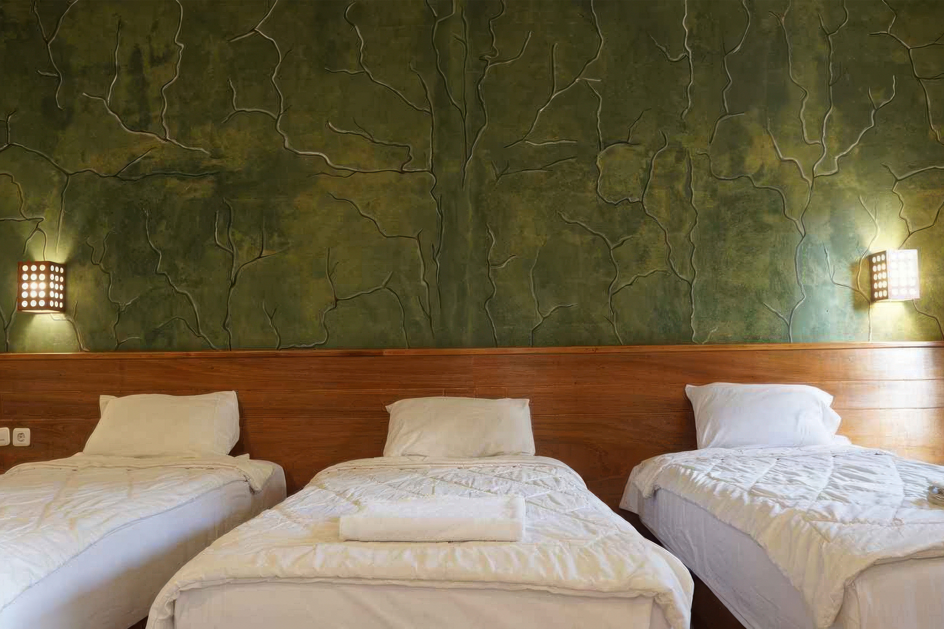Interior kamar memadukan warna hijau zamrud dengan elemen kayu alami dan pencahayaan hangat. Perpaduan ini menciptakan ruang yang adem, segar, dan cocok untuk melepas penat setelah menjelajahi pesona alam Cimaja.
